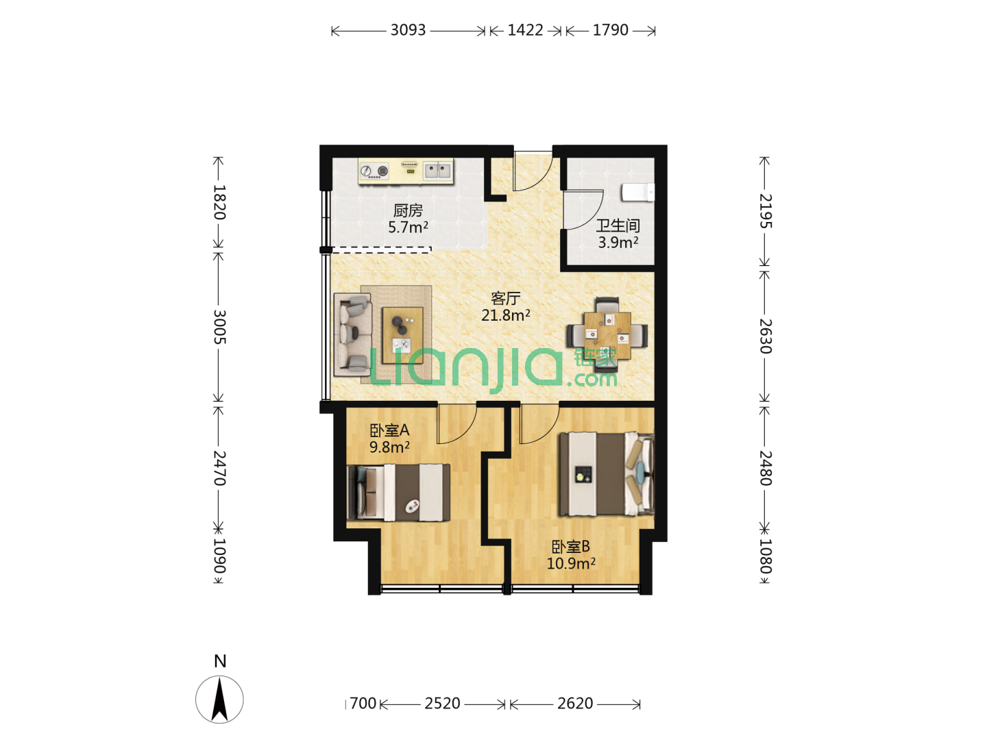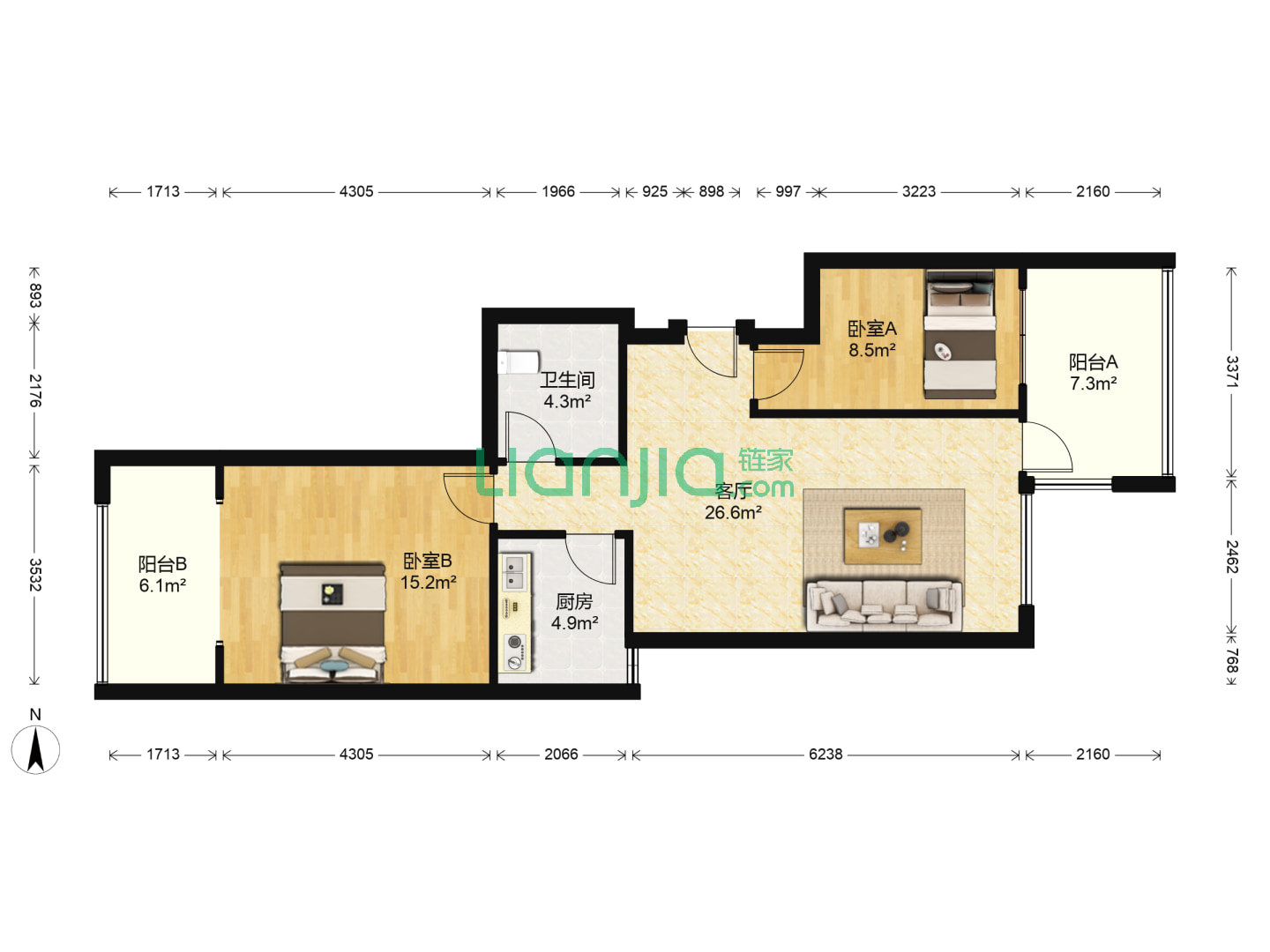 天马中心广场,2室1厅1卫 61㎡
