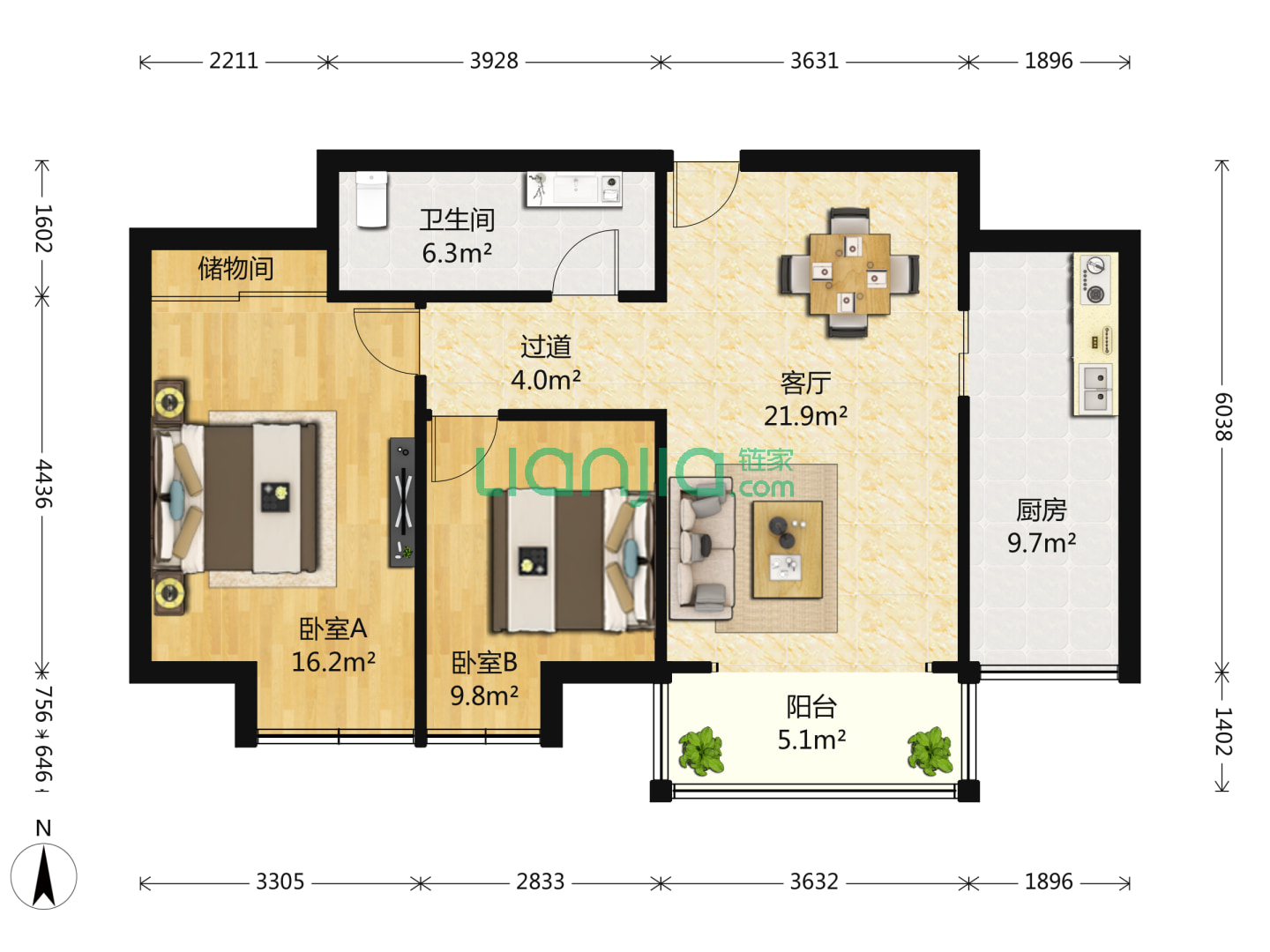 2室1厅1卫 106㎡